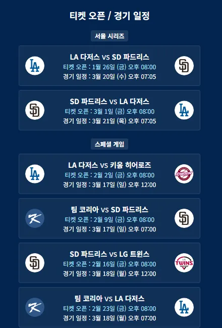 | 1월 26일(금) 오후 8시(예매완료) | 개막 1차전 | 로스앤젤레스 다저스 vs 샌디에이고 파드리스 |